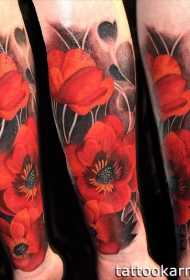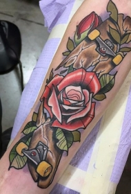 手臂彩色红玫瑰与损坏的颅骨纹身图案