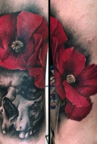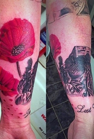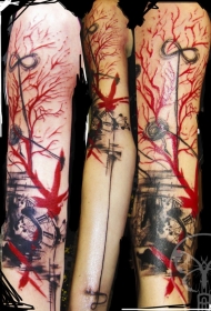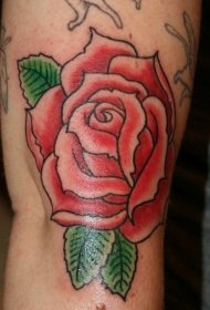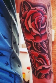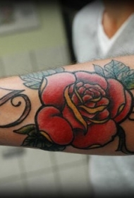 手臂卡通风格红色玫瑰与树叶纹身图案