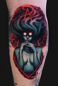 神秘的彩色恶魔女人和红眼睛手臂纹身图案