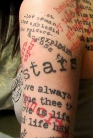 手臂红色和黑色的混乱字母纹身图案