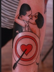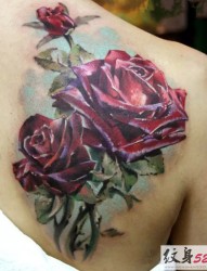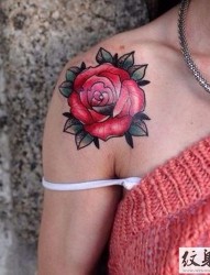 腿上漂亮的红色玫瑰花和黑色小猫纹身图片