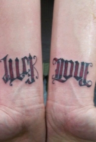 情侣手臂上黑色线条创意箭和花体英文纹身图片