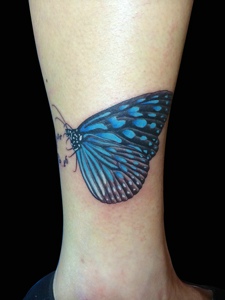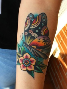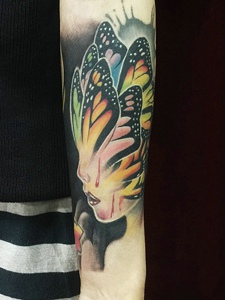 彩色蝴蝶与美女肖像混合一体的纹身图片