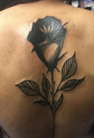 女生后背上黑色点刺简单线条创意植物花朵刺青图案图片
