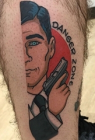 男生小腿上彩绘简单线条枪和卡通人物刺青图案图片