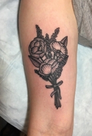 男生手臂上黑色点刺技巧简单线条植物花朵刺青图案图片