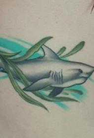 男生侧腰上彩绘渐变简单线条植物水草和鲨鱼刺青图案图片