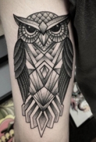 女生手臂上黑灰素描点刺技巧几何元素创意猫头鹰刺青图案图片