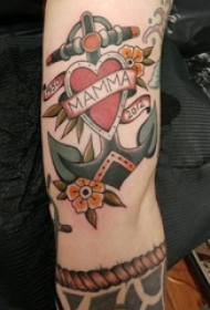 男生手臂上彩绘简单线条英文花朵和船锚刺青图案图片