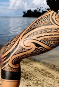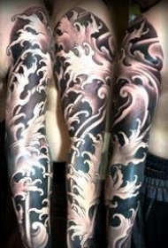 男生手臂上黑灰素描创意海浪花臂刺青图案图片