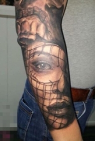男生手臂上黑色点刺简单线条人物肖像刺青图案图片