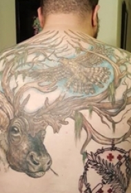 男生满背彩绘创意麋鹿小鸟与捕梦网刺青图案图片