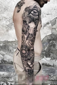 男生手臂上黑灰色花臂唯美人物肖像刺青图案图片