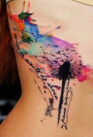 女生侧腰上黑色线条水彩泼墨蒲公英刺青图案图片