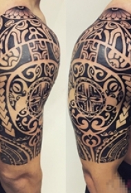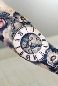 男生手臂上黑色素描点刺技巧机械元素齿轮花臂刺青图案图片