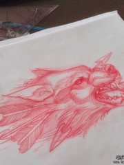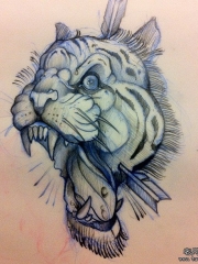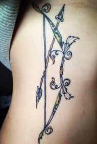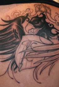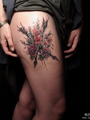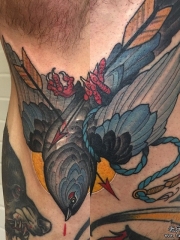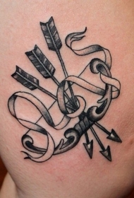 手臂上的黑灰色猫头鹰抓着箭刺骷髅头图案纹身