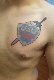男生手臂彩绘几何线条箭和盾牌纹身图片