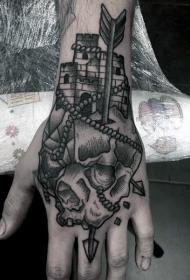 手背old school黑色骷髅与箭头纹身图案