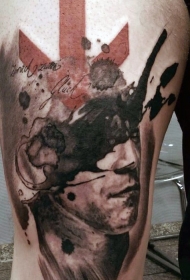 大腿神秘的黑白男子肖像与红色箭头纹身图案