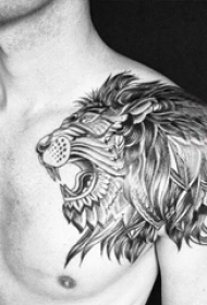 男生肩部黑色点刺抽象线条小动物狮子纹身图片