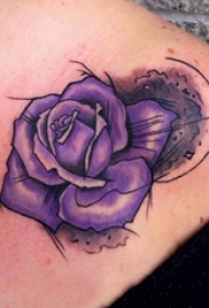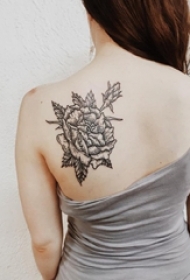 女生后肩上黑色点刺简单线条植物花朵纹身图片
