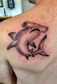 男生后肩上黑灰点刺简单线条小动物锤头鲨纹身图片