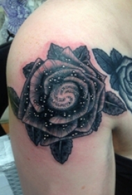 男生肩膀上黑色素描创意文艺花朵纹身图片