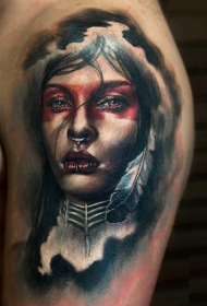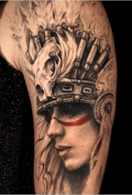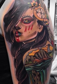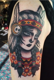 肩部老派风格的彩色印度妇女与鲜花纹身