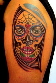 男性肩部彩色死亡女神纹身图案