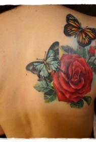 后肩彩色逼真的花朵与蝴蝶纹身