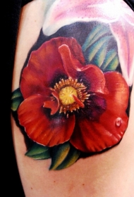 后肩上红色逼真的小花朵纹身图片