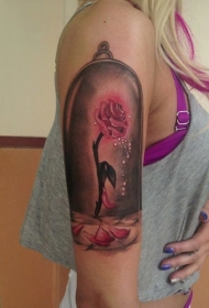 女性手臂彩色玻璃瓶中的玫瑰纹身图案