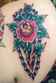 肩部老色彩色大花和叶子纹身图案