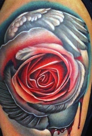 肩部华丽的彩绘玫瑰花与翅膀纹身图案