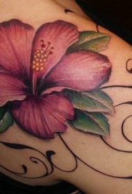 女性肩部彩色夏威夷花纹身图案