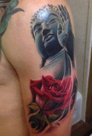 肩部逼真的如来佛祖雕像和玫瑰花纹身