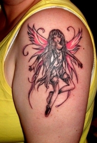 大臂简单的彩色玫瑰与神秘的脸纹身图案