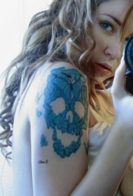 可爱的蓝色蝴蝶骷髅大臂纹身图案