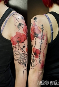 女生手臂罂粟花结合机械模式纹身图案