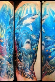 大臂色彩斑斓的海底逼真鲨鱼纹身图案