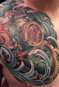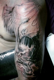 大臂五彩的恶兽与交叉的骨头纹身图案