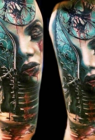 大臂彩色的毛骨悚然女人与楼梯纹身图案