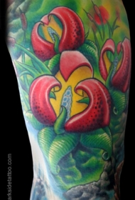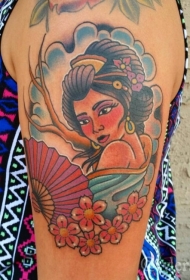 手臂漂亮的彩色花朵和扇子女人纹身图案