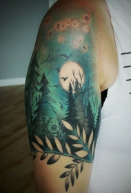 手臂美丽的彩色夜森林小鸟和星星纹身图案