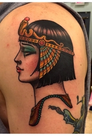 大臂old school彩色美女肖像花朵蛇纹身图案