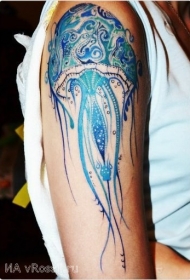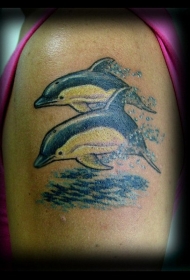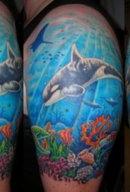 大臂彩绘上钩的鱼和蜻蜓纹身图案