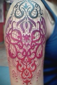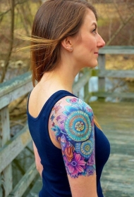 女生大臂美丽的五彩花卉蝴蝶纹身图案