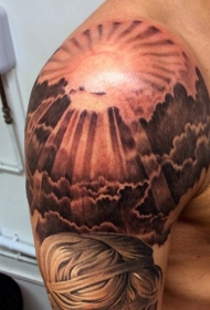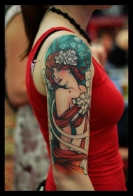 大臂自然的彩色美丽女生肖像与花卉纹身图案