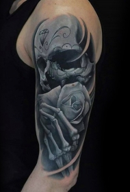 肩部美丽的彩色心形锁与玫瑰纹身图案
