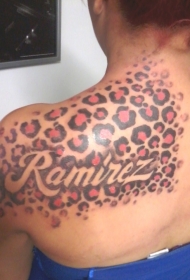 女生肩部彩色的豹纹字母纹身图案